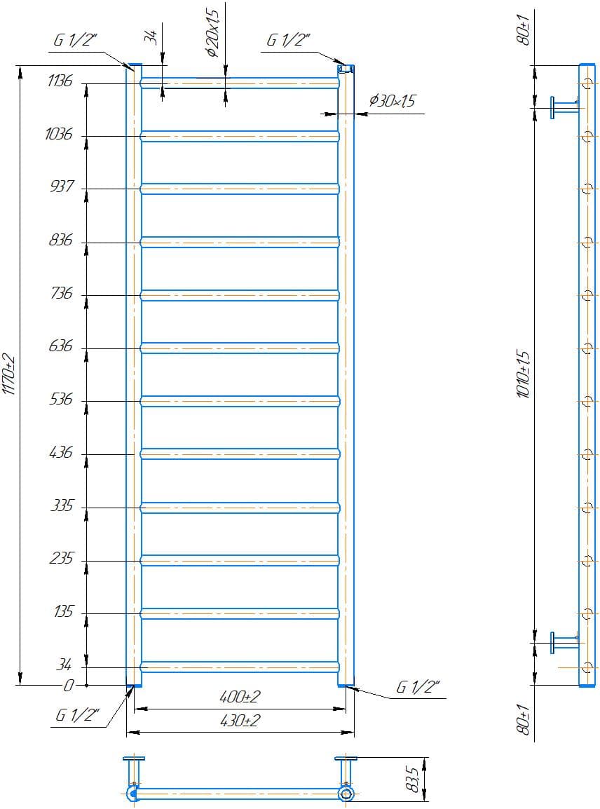 Водяна рушникосушарка INOX Флет 1170х430/400
